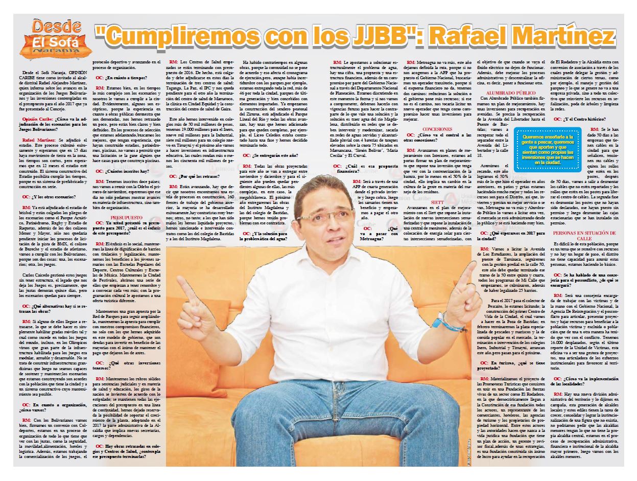 Desde el Sofá Naranja, OPINIÓN CARIBE tiene como invitado al alcalde distrital Rafael Alejandro Martínez, quien informa sobre los avances en la organización de los Juegos Bolivarianos y las inversiones contempladas en el presupuesto para el año 2017 que ya fue presentado al Concejo.