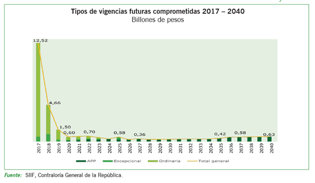 El 63.9 % de las vigencias futuras comprometidas son ordinarias, que se encuentran concentradas en los primeros 5 años y en especial entre 2017 y 2018, el 9.3 % son excepcionales que van hasta el año 2025 y el 26.7 % corresponden a vigencias futuras adquiridas para respaldar Asociaciones Públicos Privadas APP y en especial, las denominadas vías de cuarta generación y que van hasta el año 2040. La falta de control de dichas vigencias futuras ha permitido inclusive que se autoricen vigencias futuras en dólares que no tienen respaldo en ninguna Ley.