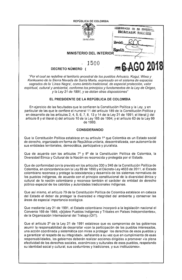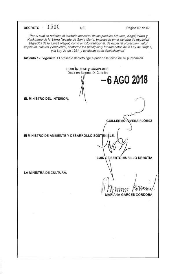 Fue creada en 1973 y ha sido desarrollada por distintas normatividades. Lo que hizo el gobierno de Juan Manuel Santos fue acatar los fallos de la Corte Constitucional en la materia. No era un capricho de la anterior administración, era un mandato y una decisión de Estado que debía cumplirse. El decreto es producto de un trabajo de cuatro años de concertación entre el Gobierno y las comunidades, con el fin de especificar y elaborar una descripción física, cultural y ancestral detallada de cada uno de los espacios sagrados de la Línea Negra.