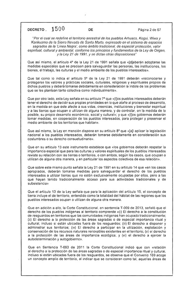 De hecho, hacen parte de la cosmovisión de los pueblos de la Sierra Nevada de manera articulada e interdependiente, en una relación estrecha con el territorio. Lo anterior, no implica ningún requisito nuevo, pues desde la misma Constitución Política de Colombia ya se habían establecido los mismos, y el decreto se limita a mencionarlos y desarrollarlos. Por ejemplo, la carta política señala: