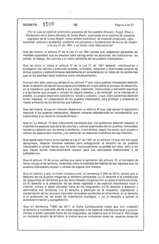 En el Decreto 1500 de 2018 no se le da ninguna nueva potestad a las comunidades indígenas relacionada con la Consulta previa. De hecho, el concepto Consulta Previa no es mencionado ni una sola vez en el texto de la norma, por tanto, no le concede ningún poder a los pueblos indígenas que habitan la Sierra Nevada de Santa Marta ni amplía sus facultades para llevar a cabo consultas previas.