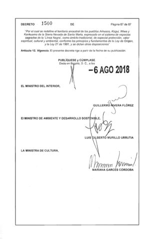 Es importante destacar, que el Decreto 1500 de 2018 no contempla ningún mecanismo nuevo de participación ni requisitos adicionales a los que ya se encuentran en la ley para los proyectos económicos que quieran realizase en este territorio. Lo que sí es cierto es que busca obligar a los dueños de los terrenos a conservar la riqueza ambiental, es decir, respetar y cuidar los animales y plantas de la Sierra Nevada. Lo anterior, porque estos ecosistemas no se conciben desde la lógica de las comunidades de manera desconectada y porque la Sierra Nevada es un área de interés mundial en términos de conservación ambiental y cultural.