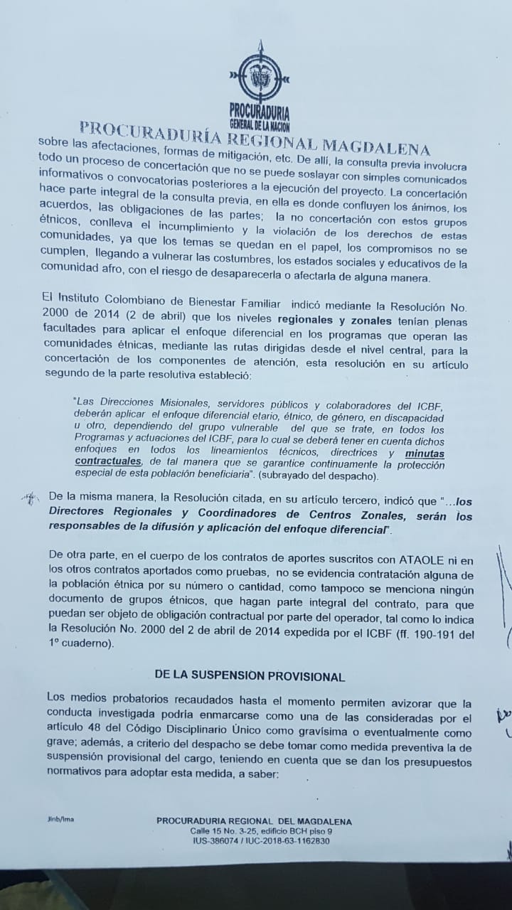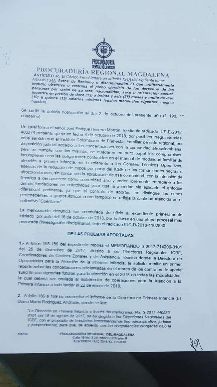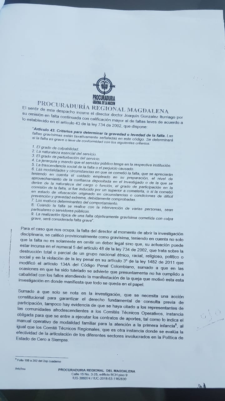Los antecedentes señalan que “mediante auto del 17 de agosto de 2018, este despacho ordenó abrir investigación disciplinaria en contra del Director Regional Magdalena del Icbf, Joaquín González, por tratarse de una posible vulneración de derechos fundamentales a un grupo étnico y en especial a una comunidad afrocolombiana, no solamente se considera como el incumplimiento de un deber legal al no darle cumplimiento a una orden judicial, sino que, la falta puede estar determinada como gravísima al tenor del artículo 48 numeral 5 de la Ley 734de 2002, en el sentido que la conducta desplegada por el investigado o investigados, pueden ocasionar una lesión a la integridad física o mental de los miembros del grupo hasta el punto que determine su desaparición como grupo étnico; o que también pueda estar lindando en el campo de lo penal, tal como lo describe el artículo 3 de la Ley 1482 de 2011, que modificó el artículo 134 A del Código Penal’’, indica.
