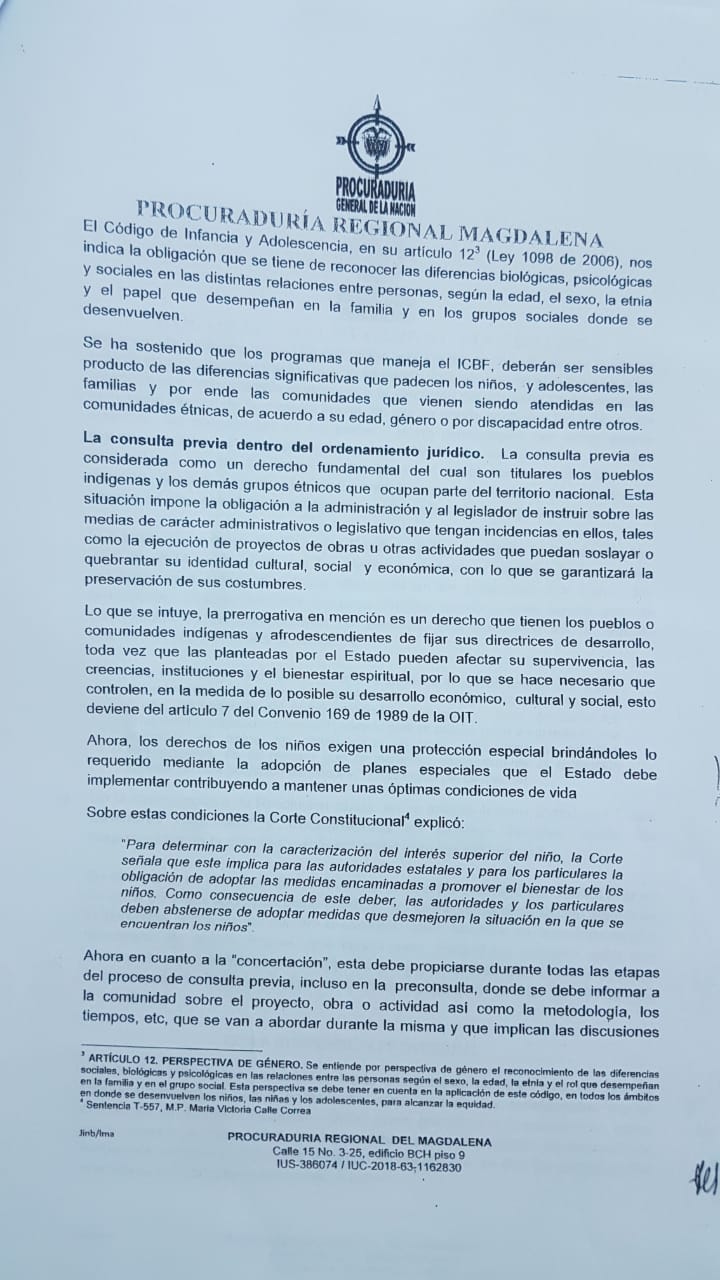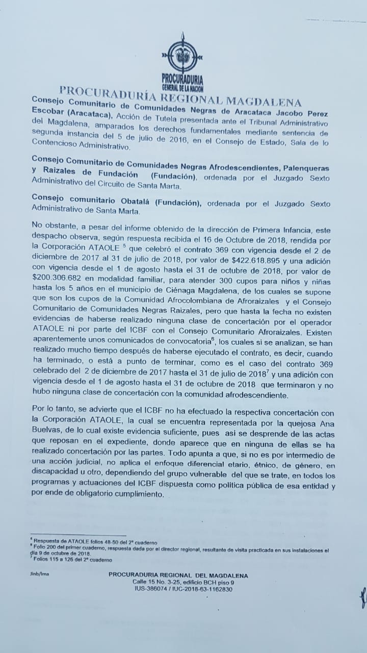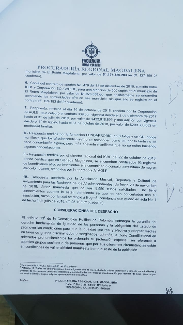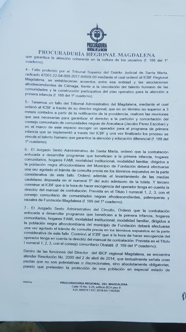 Los antecedentes señalan que “mediante auto del 17 de agosto de 2018, este despacho ordenó abrir investigación disciplinaria en contra del Director Regional Magdalena del Icbf, Joaquín González, por tratarse de una posible vulneración de derechos fundamentales a un grupo étnico y en especial a una comunidad afrocolombiana, no solamente se considera como el incumplimiento de un deber legal al no darle cumplimiento a una orden judicial, sino que, la falta puede estar determinada como gravísima al tenor del artículo 48 numeral 5 de la Ley 734de 2002, en el sentido que la conducta desplegada por el investigado o investigados, pueden ocasionar una lesión a la integridad física o mental de los miembros del grupo hasta el punto que determine su desaparición como grupo étnico; o que también pueda estar lindando en el campo de lo penal, tal como lo describe el artículo 3 de la Ley 1482 de 2011, que modificó el artículo 134 A del Código Penal’’, indica.