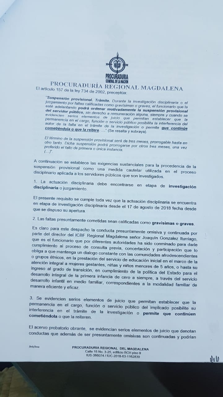 El auto resuelve que ‘‘así las cosas, las circunstancias de modo, tiempo y lugar en que se ha venido desarrollando la conducta del disciplinado e investigado señor Joaquín González Iturriago, en quien recae la responsabilidad de implementar el enfoque diferencias en estas comunidades negras (según resolución No, 2000 de 2014 del ICBF) sin duda permiten concluir que se dan los requisitos para ordenar la suspensión provisional del doctor Joaquín González Iturriago como Director Regional del ICBF Magdalena, por cuanto su comportamiento en relación con los hechos ha consistido en dejar que persista la conducta afectando a comunidades de especial protección’’, puntualiza la Procuraduría Regional del Magdalena.