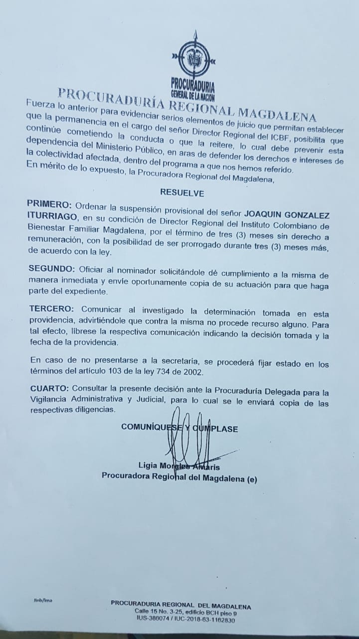 El director Regional del Instituto Colombiano de Bienestar Familiar, Joaquín González Iturriago, fue suspendido por tres meses sin derecho a remuneración por la Procuraduría Regional del Magdalena, por presunta vulneración de los derechos fundamentales a un grupo étnico y en especial a una comunidad afrocolombiana.