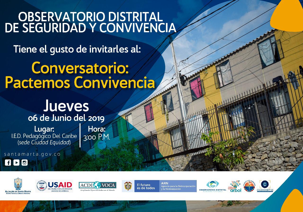 El Observatorio Distrital de Seguridad y Convivencia recibe información detallada de las problemáticas que se presentan de manera reiterada en Santa Marta en materia de Seguridad y Convivencia, es por ello que Una de las prioridades del Observatorio es poner en la agenda de los samarios, temas que requieren ser tratados por todos. Construir ciudad requiere del trabajo mancomunado de ciudadanos, autoridades distritales y departamentales, sector privado, entidades del sector público, academia, entre otros, y es por ello que en la búsqueda de lugares de encuentro que permitan construir de manera colectiva y participativa la Ciudad, son propuestos una serie de conservatorios. De la mano de aliados importantes como Acdi Voca y Casa en el Árbol, se invita a Ciudad Equidad a iniciar un diálogo abierto y propositivo sobre la convivencia.
