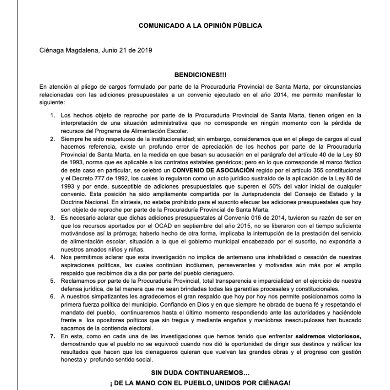 El exmandatario cienaguero, espera que la entidad disciplinaria falle a su favor al presentar todas las pruebas por las que se formularon los pliegos de cargos por presuntas irregularidades en la suscripción de un contrato de alimentación escolar con Asoalimentarce.