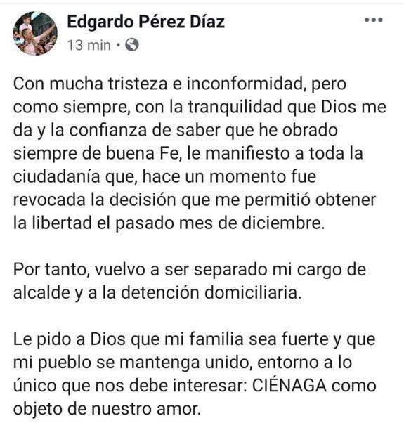 El Juzgado Cuarto Penal del Circuito de Santa Marta le revocó la libertad al alcalde de Ciénaga, Edgardo Pérez Díaz.