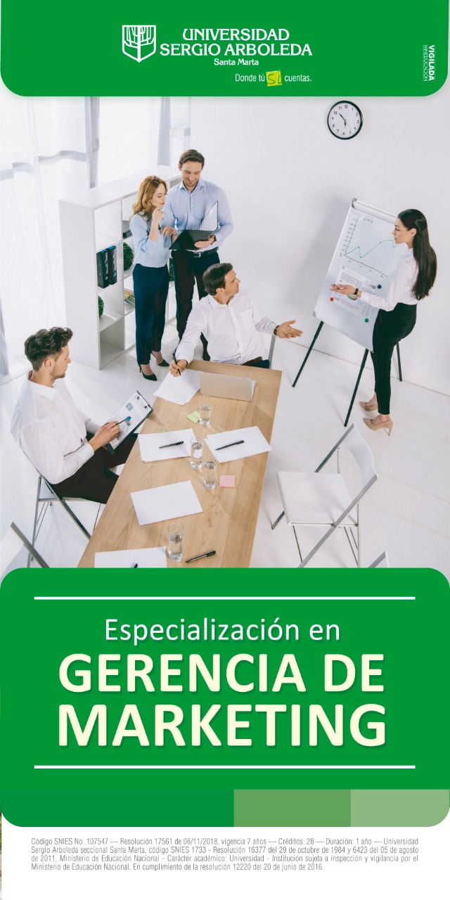 El objetivo del programa académico es permitir a los profesionales una amplia visión del marketing como estrategia de dirección, enfocándose en el desarrollo de competencias y habilidades necesarias para un gerente de marketing. Estas particularidades están apoyadas en los pilares humanísticos y éticos, distinguidos como sello de identidad de la Universidad Sergio Arboleda.