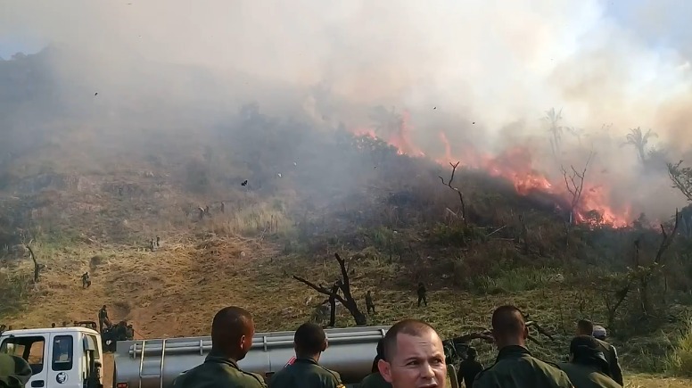 Varios uniformados de la institución con sus chaquetas y sus propias prendas de vestir intentan por todos los medios de sofocar el fuego, mientras que otros, con largas mangueras, tratan de controlar las llamas antes que avancen y provoquen una tragedia ambiental más grande.