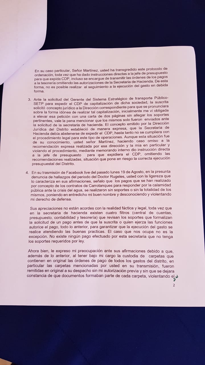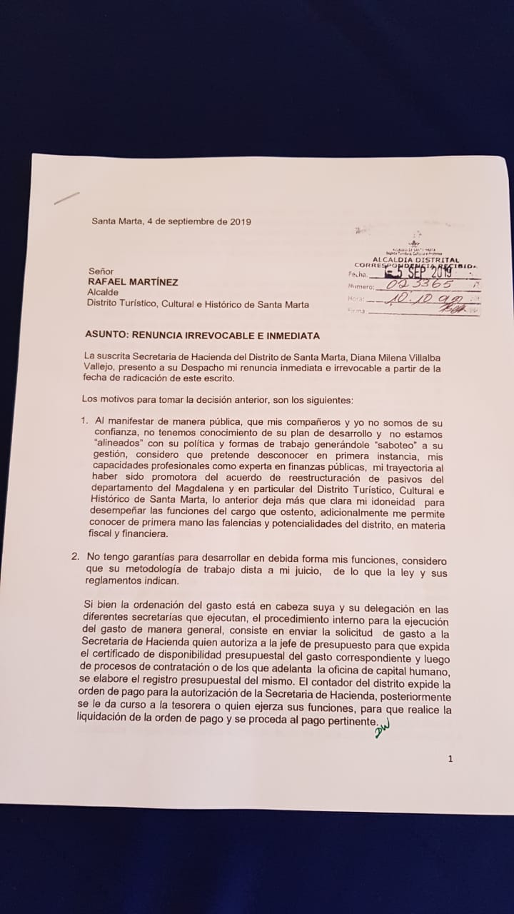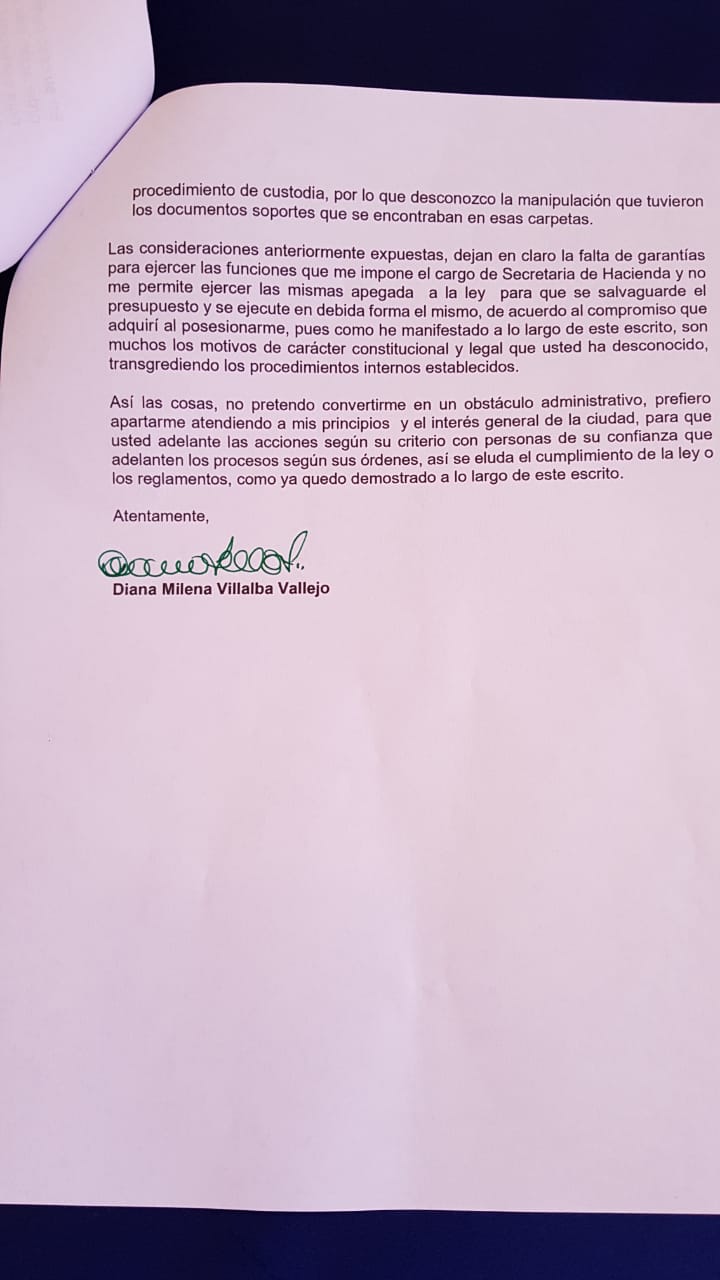 Asimismo, dejan la Alcaldía tras presentar su renuncia: Diana Villalba, quien se desempeñaba como secretaria de Hacienda y Zugel Camargo, quien tenía el cargo de secretaria General de la Alcaldía.