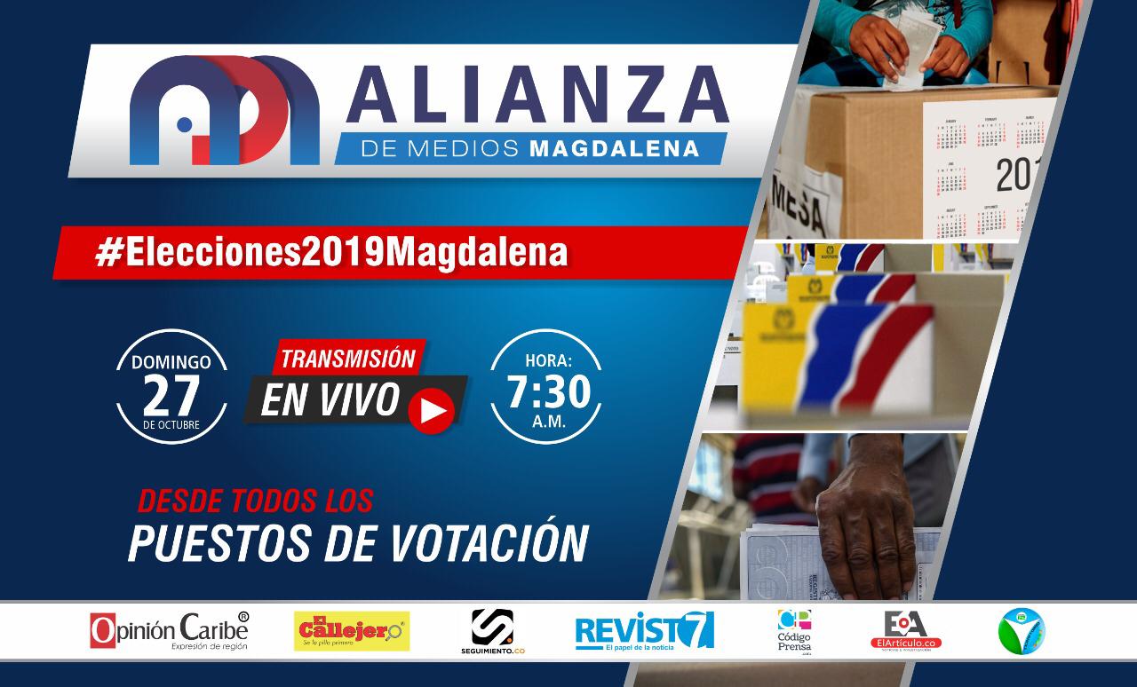 En esta oportunidad se unen los medios para transmitir las #Elecciones2019Magdalena, todo lo que sucede en los puestos de votación, comandos, centro de acopio, escrutinios y Registraduría será noticia en: Opinión Caribe y El Callejero, cuyo director es Víctor Rodríguez; Revista 7 medio que dirige Lina Contreras, ElArtículo.co dirigido por Lina María Peña, Seguimiento.co cuyo director es Polo Díaz-Granados, Código Prensa dirigido por Diana Solera y Canal Territorio que es dirigido por Víctor Polo.