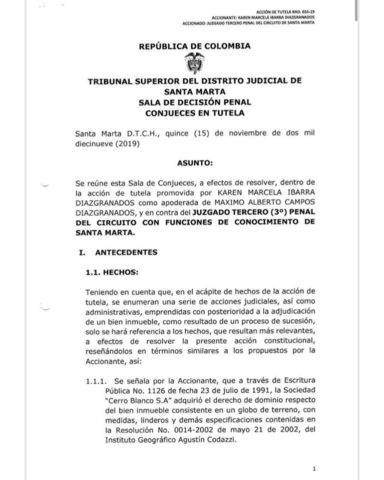 No obstante lo anterior, la sociedad Cerro Blanco, desconociendo el proceso administrativo que hace tránsito a cosa juzgada, inició proceso penal correspondiéndole al Juzgado Sexto Penal Municipal de Control de Garantías de Santa Marta, quien en audiencia del 30 de enero de 2019, accedió a la solicitud del abogado de Cerro Blanco S.A., y ordenó como medida cautelar de carácter provisional la suspensión de las anotaciones donde se acredita la titularidad del predio a favor del Distrito de Santa Marta.