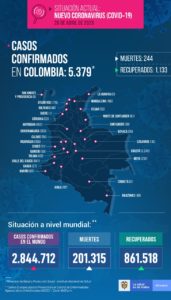 En el caso de Colombia, la Covid19, nuestra invitada de hoy, ha mostrado su eficacia a pesar de las decisiones adoptadas por el Gobierno Nacional para contener su acción y evitar el colapso del precario sistema de salud. Es así como la cifra, preocupante por demás, soporta un registro de 244 muertos, 5.379 infectados y el guarismo esperanzador de 1.133 recuperados hasta la fecha.