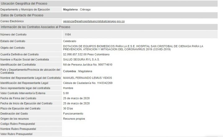 El contrato de dotación está suscrito entre el exgerente del hospital, Ángel Fernández Gamero y el contratista de la empresa seleccionada por la administración municipal para el suministro de los equipos, Salud Segura R y L S.A.S.