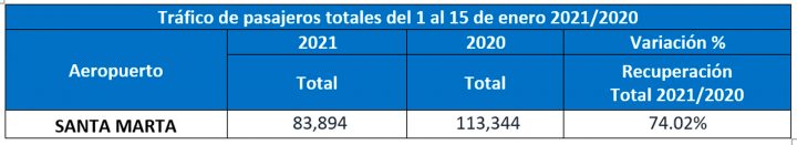 La Concesión Aeropuertos de Oriente S.A.S., dio a conocer que el tráfico total de pasajeros movilizados durante el mes de diciembre de 2020 llegó a 133.861 y se ejecutaron 970 operaciones de tipo comercial en el aeropuerto internacional Simón Bolívar de Santa Marta.