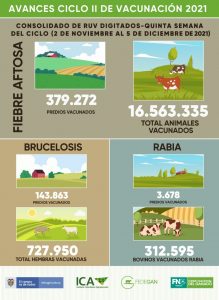 Colombia completó la quinta semana de ejecución del segundo ciclo de vacunación contra la fiebre aftosa del año 2021. En este lapso ha vacunado 16,5 millones de animales lo que equivale al 56 % del total del hato a nivel nacional.