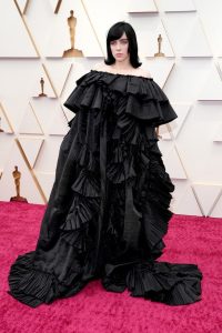 La cantante Billie Eilish, de negro y con volantes, de Gucci. Ha sido una de las responsables de amenizar la velada interpretando ´No Time to Die´. También se ha llevado el Oscar, junto a su hermano, por este trabajo.