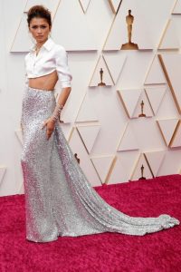 Zendaya, actriz de ´Dune´, nominada a mejor película, espectacular con un conjunto de Valentino de camisa corta y falda de lentejuelas. Las joyas son de Bvlgari.