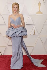 Nicole Kidman, nominada a mejor actriz por ´Being the Ricardos´. Armani Privé está detrás del impecable vestido con peplum de la australiana; y Harry Winston firma sus joyas.