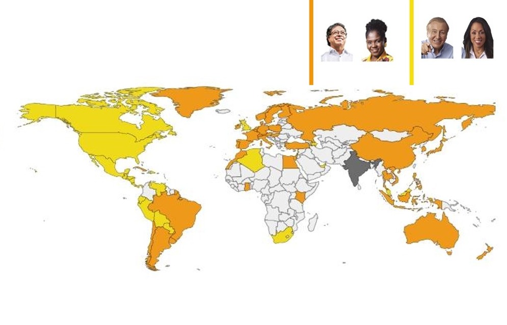 El presidente electo Gustavo Petro obtuvo el 37,52% de los votos en el extranjero y ganó en Alemania, Argentina, Australia, Austria, Bélgica, Brasil, Chile, China, Corea del Sur, Cuba, Dinamarca, Egipto, España, Finlandia, Francia, Ghana, Hungría, Indonesia, Irlanda, Italia, Japón, Kenia, Luxemburgo, Marruecos, Noruega, Nueva Zelandia, Países Bajos, Polonia, Portugal, Filipinas, Vietnam, Rusia, Suecia, Suiza, Tailandia, Turquía y Uruguay.