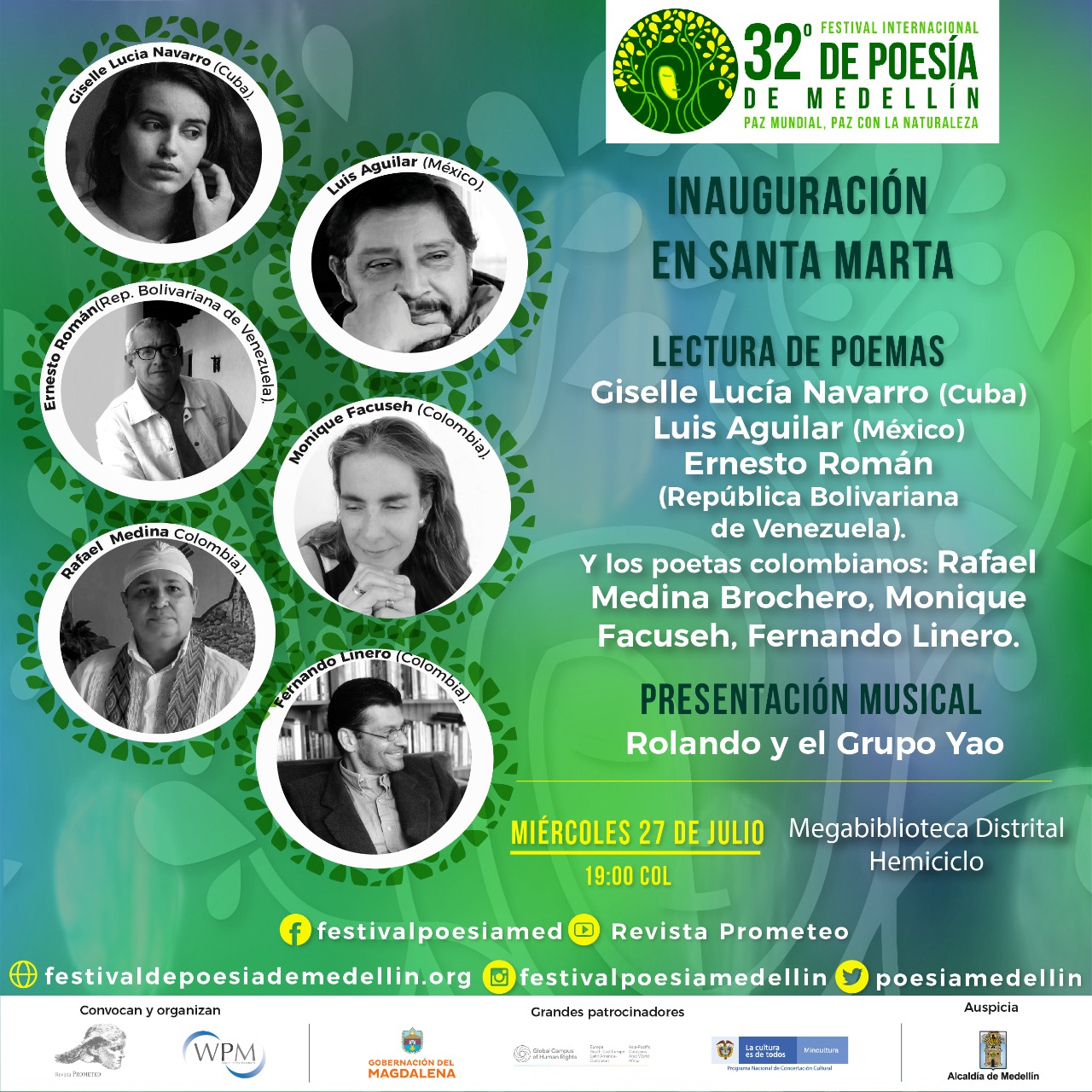 El acto de inauguración tendrá lugar en en el hemiciclo de la Megabiblioteca Distrital, con la participación de los poetas Giselle Lucía Navarro (Cuba), Luis Aguilar (México), Ernesto Román (República Bolivariana de Venezuela), Monique Facuseh (Colombia), Fernando Linero (Colombia), Rafael Medina Brochero (Colombia) y la presentación musical de Rolando y el Grupo Yao.