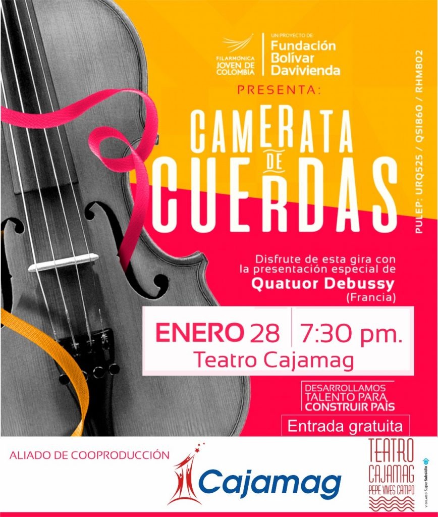 Este 28 de enero, el Teatro Cajamag en su franja de Música del Mundo tiene programado el Concierto de la Orquesta Filarmónica Joven, de quién vuelve este 2023 con la Camerata de Cuerdas ´La Joven’ para ofrecer a los espectadores colombianos una experiencia única dónde podrán vivir la música de cámara de una forma inusual y arriesgada, acompañados desde Francia con su artista invitado: Quatuor Debussy.