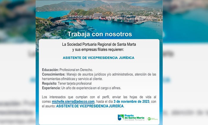 La Sociedad Portuaria Regional de Santa Marta y sus empresas filiales requieren un Asistente de Vicepresidencia Jurídica.