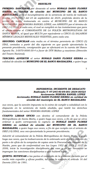 “SANCIONAR por desacato al señor RONALD DARIO FLOREZ SIERRA en calidad de alcalde del MUNICIPIO DE EL BANCO MAGDALENA, ante el incumplimiento de la sentencia de tutela de radicado interno 2024-00523 del 23 de septiembre de 2024, proferida dentro de la acción de tutela instaurada en contra el MUNICIPIO DE EL BANCO MAGDALENA. por NOHORA RANGEL LÓPEZ, con ARRESTO por el término de DIEZ (10) DÍAS, a cada uno, el cual se cumplirá en las instalaciones que para el efecto asigne el COMANDANTE DE LA POLICÍA METROPOLITANA DE SANTA MARTA, al igual que MULTA por equivalente a CINCO (5) SALARIOS MÍNIMOS LEGALES MENSUALES VIGENTES, para cada uno”, se lee en el documento.