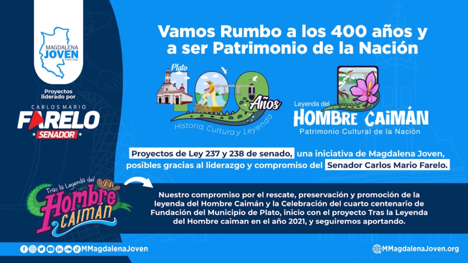 En un momento trascendental para el municipio de Plato, Magdalena, y su riqueza cultural, la organización Magdalena Joven celebra la aprobación en segundo debate, en la plenaria del Senado de la República, de dos importantes proyectos de ley liderados y de autoridad del senador Carlos. Mario Farelo Daza, iniciativas promovidas con entusiasmo por esta organización.