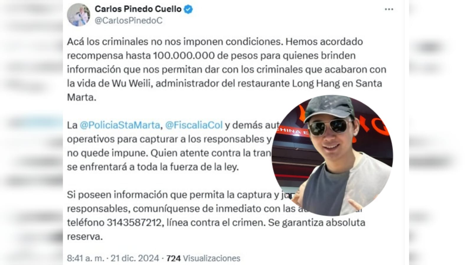 El alcalde de Santa Marta, Carlos Pinedo Cuello, anunció a través de su cuenta en X una recompensa de hasta 100.000.000 de pesos para quienes brinden información que conduzca a la captura de los presuntos criminales del asesinato de Wu Weili, administrador del reconocido restaurante Long Hang en la ciudad.