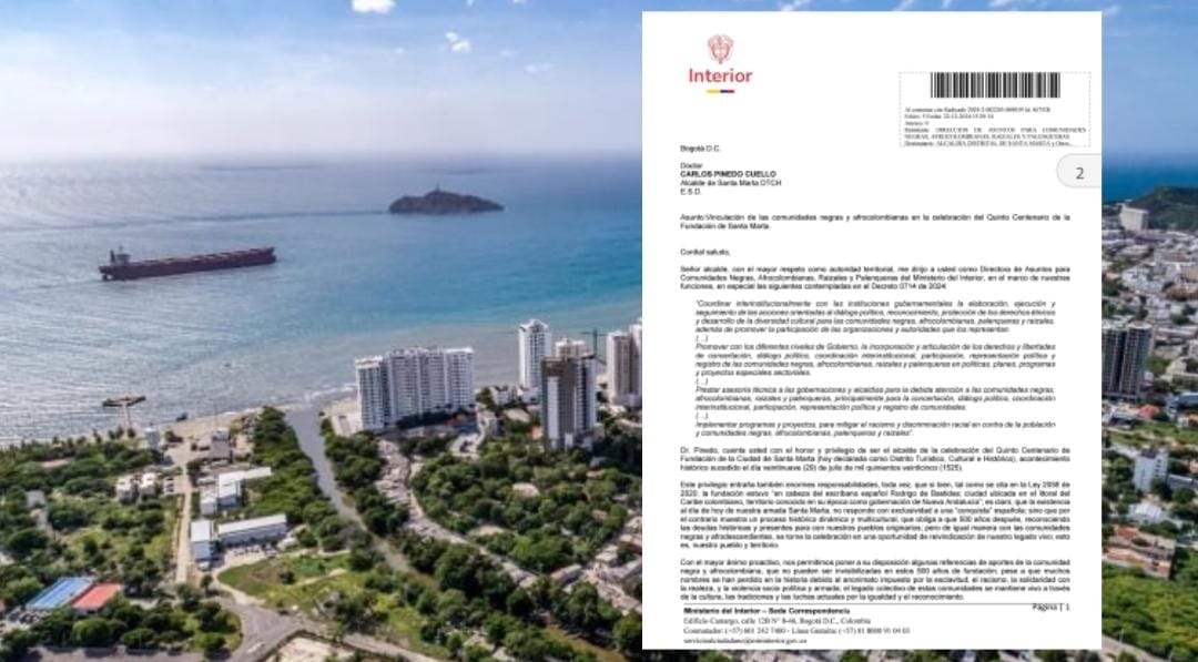 La Directora de Asuntos para Comunidades Negras, Afrocolombianas, Raizales y Palenqueras del Ministerio del Interior, Amelia Cotes, ha solicitado formalmente al alcalde de Santa Marta, Carlos Pinedo Cuello, la incorporación activa de estas comunidades en la planeación y ejecución de la conmemoración del Quinto Centenario de la ciudad. A través de un oficio, la funcionaria destacó la importancia histórica, cultural y social de estas comunidades en la construcción de la identidad samaria.
