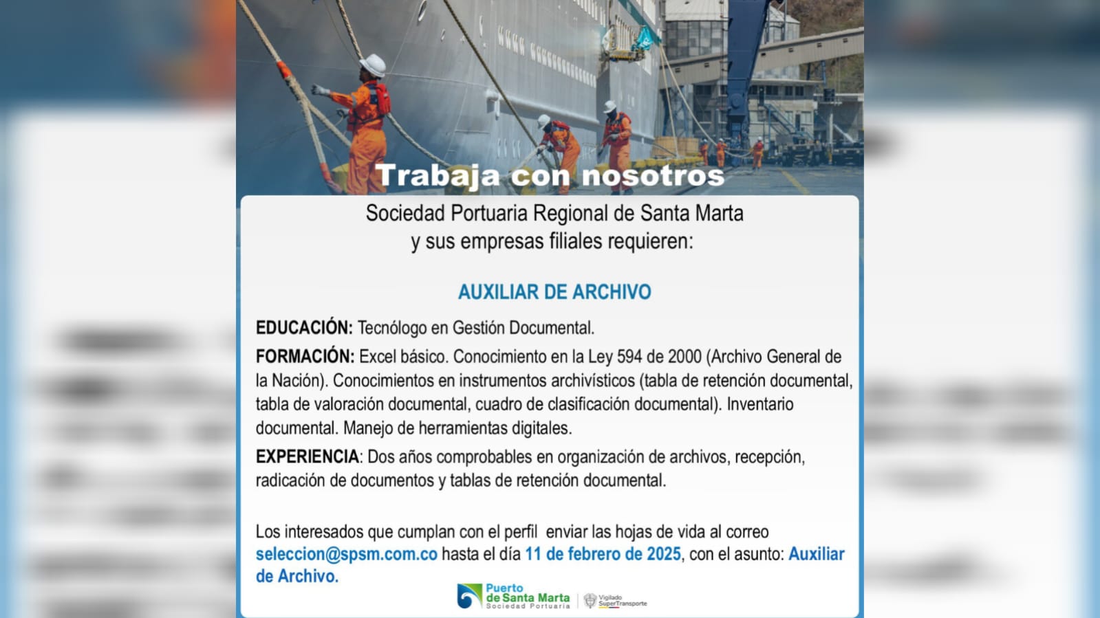 La Sociedad Portuaria Regional de Santa Marta y sus empresas filiales requieren un Auxiliar de archivo.