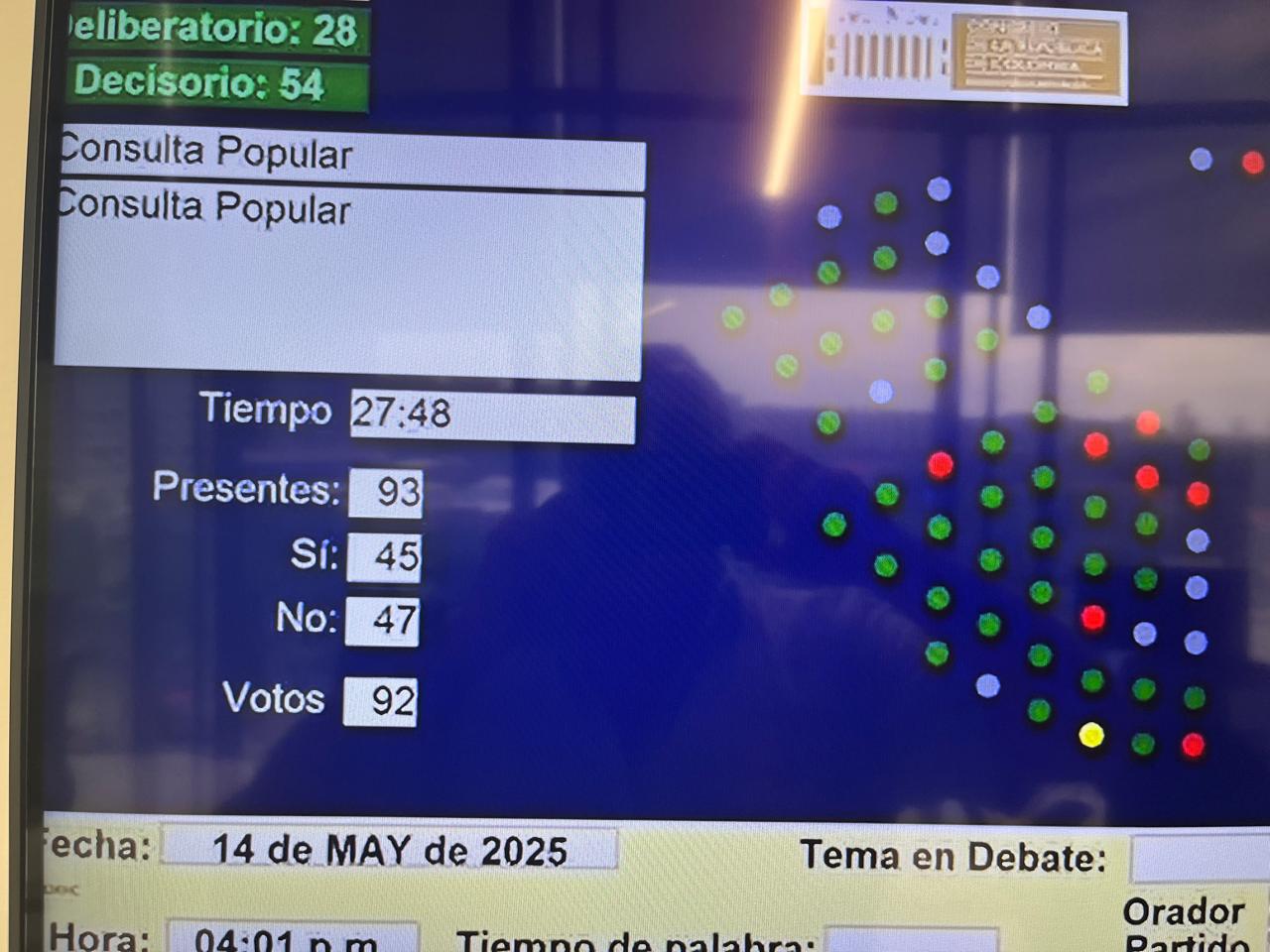 La votación final fue de 47 votos por el sí y 49 por el no, razón por la cual se dio concepto negativo a la petición del Ejecutivo y no se podrá convocar a los colombianos a las urnas.