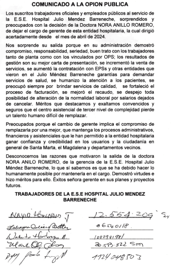 El Sindicato Nacional de la Salud y Seguridad Social – Sindess, seccional Santa Marta, a través de un comunicado manifestó su preocupación ante la salida de la gerencia de la a E.S.E. Hospital Julio Méndez Barreneche, Nora Anillo Romero.