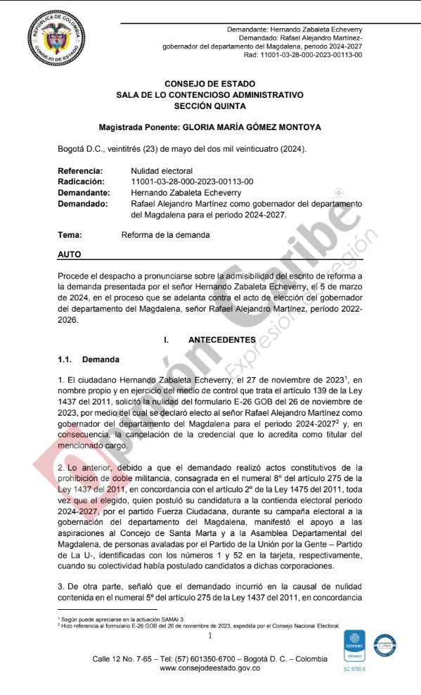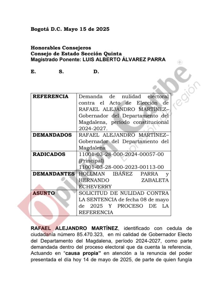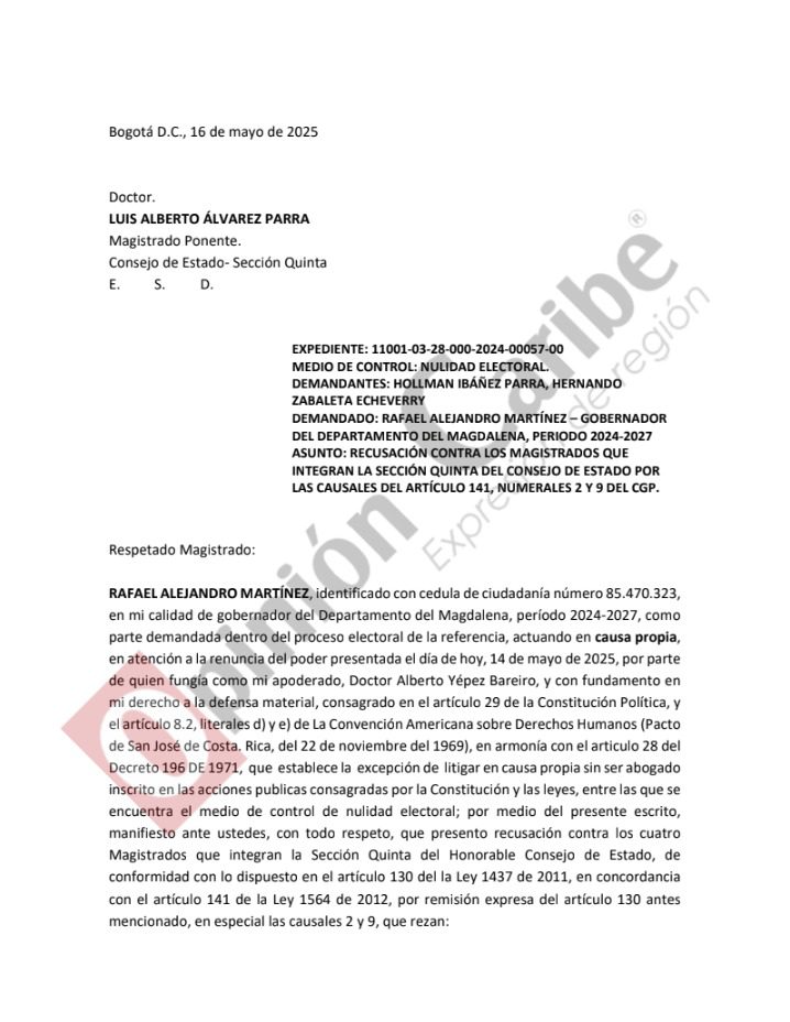 El exalcalde de Santa Marta presentó una solicitud de nulidad de la sentencia, alegando que no fue debidamente notificado del proceso, lo que vulneró su derecho al debido proceso y el de los votantes en zonas rurales sin conectividad. Además, recusó a los magistrados de la Sección Quinta del Consejo de Estado, asegurando que ya habían fallado en su contra en otros procesos y que no son imparciales. La recusación busca apartar del caso a quienes, según Martínez, han mostrado animadversión hacia Fuerza Ciudadana.