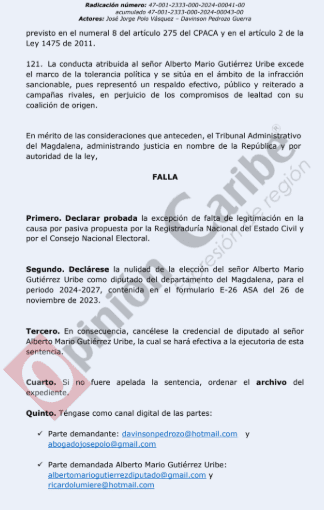 “Declárese la nulidad de la elección del señor Alberto Mario Gutiérrez Uribe como diputado del departamento del Magdalena, para el periodo 2024-2027, contenida en el formulario E-26 ASA del 26 de noviembre de 2023”, se lee en el documento.