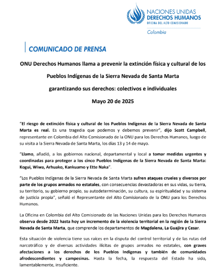 La Oficina del Alto Comisionado de las Naciones Unidas para los Derechos Humanos emitió un llamado urgente a las autoridades colombianas para prevenir la desaparición física y cultural de los pueblos indígenas que habitan la Sierra Nevada de Santa Marta: Kogui, Wiwa, Arhuako, Kankuamo y Ette Naka.