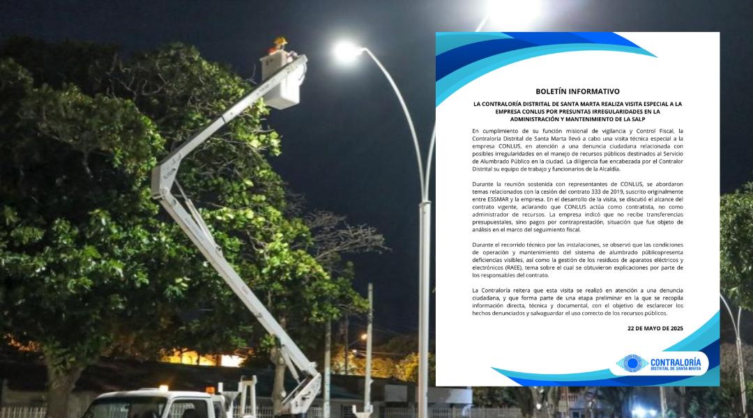 A través de un comunicado, la Contraloría Distrital de Santa Marta señaló que realizó una visita de inspección a las instalaciones de la empresa CONLUS, contratista del servicio de alumbrado público, tras recibir una denuncia por presuntas irregularidades en el manejo de recursos públicos vinculados al Contrato 333 de 2019, suscrito con la Empresa de Servicios Públicos de Santa Marta (ESSMAR).