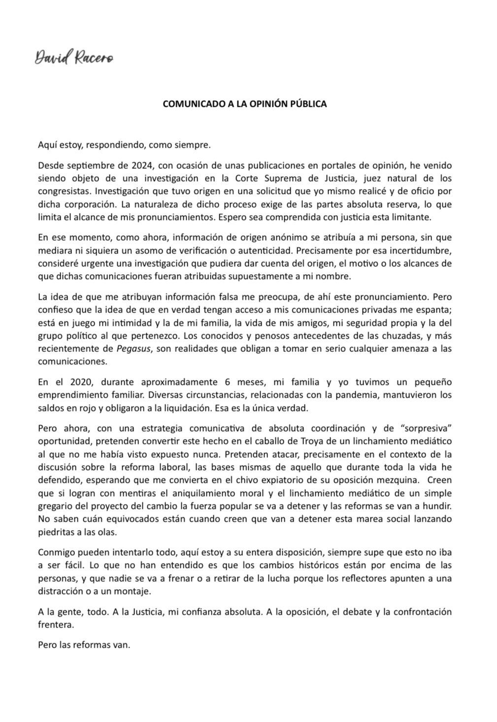 Comunicado a la opinión pública de David Racero, mediante X.