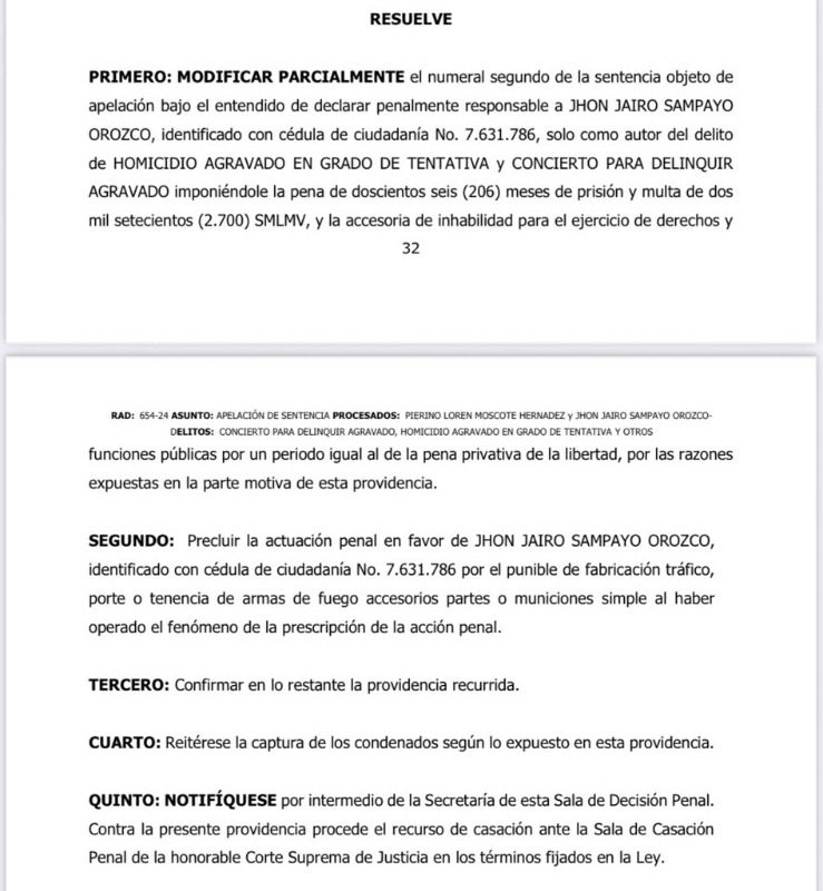 El tribunal también precluyó la acción penal contra Jhon Jairo Sampayo Orozco por el delito de fabricación, tráfico o tenencia de armas de fuego, al considerar que prescribió el término para juzgarlo.