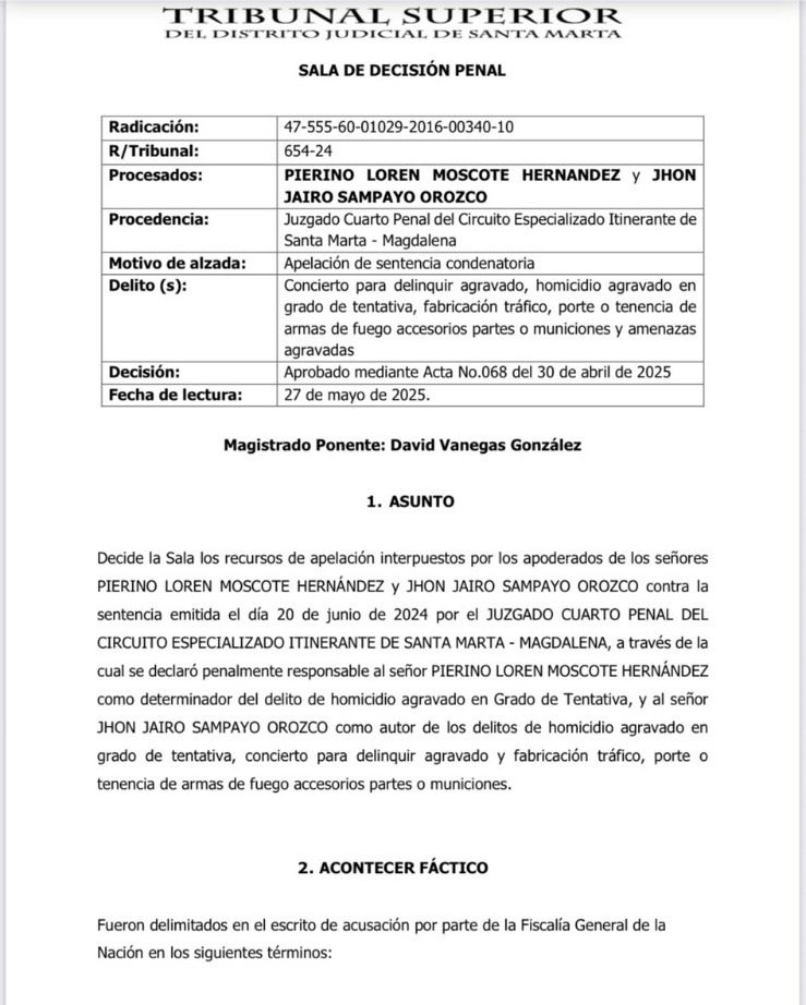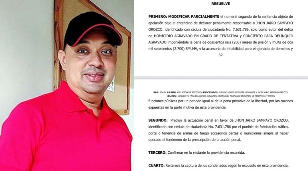 El Tribunal Superior de Santa Marta confirmó la sentencia por tentativa de homicidio agravado y concierto para delinquir en contra del prófugo exalcalde Pierino Moscote, quien habría ordenado el ataque contra un líder social que lo había denunciado por falsificación de documentos en el 2016.