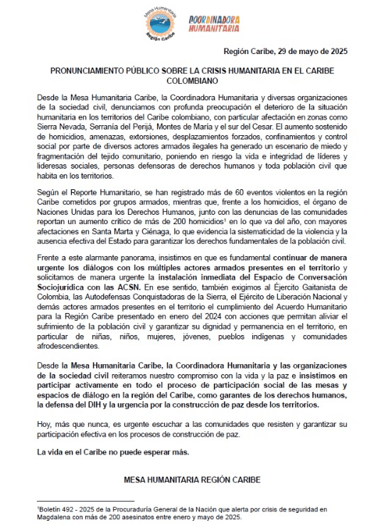 Desde la Mesa Humanitaria Caribe, la Coordinadora Humanitaria y diversas organizaciones de la sociedad civil, denunciamos con profunda preocupación el deterioro de la situación humanitaria en los territorios del Caribe colombiano, con particular afectación en zonas como Sierra Nevada, Serranía del Perijá, Montes de María y el sur del Cesar. El aumento sostenido de homicidios, amenazas, extorsiones, desplazamientos forzados, confinamientos y control social por parte de diversos actores armados ilegales ha generado un escenario de miedo y fragmentación del tejido comunitario, poniendo en riesgo la vida e integridad de líderes y lideresas sociales, personas defensoras de derechos humanos y toda población civil que habita en los territorios.