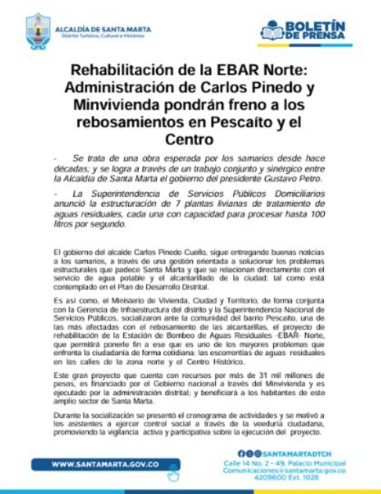 Es así como, el Ministerio de Vivienda, Ciudad y Territorio, de forma conjunta con la Gerencia de Infraestructura del distrito y la Superintendencia Nacional de Servicios Públicos, socializaron ante la comunidad del barrio Pescaíto, una de las más afectadas con el rebosamiento de las alcantarillas, el proyecto de rehabilitación de la Estación de Bombeo de Aguas Residuales -EBAR- Norte, que permitirá ponerle fin a ese que es uno de los mayores problemas que enfrenta la ciudadanía de forma cotidiana: las escorrentías de aguas residuales en las calles de la zona norte y el Centro Histórico.