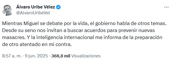 Mientras Miguel Uribe lucha por su vida tras el atentado, el expresidente señaló que “el gobierno habla de otros temas”. Además, el expresidente reveló que la inteligencia internacional le ha informado de la preparación de otro atentado en su contra.
