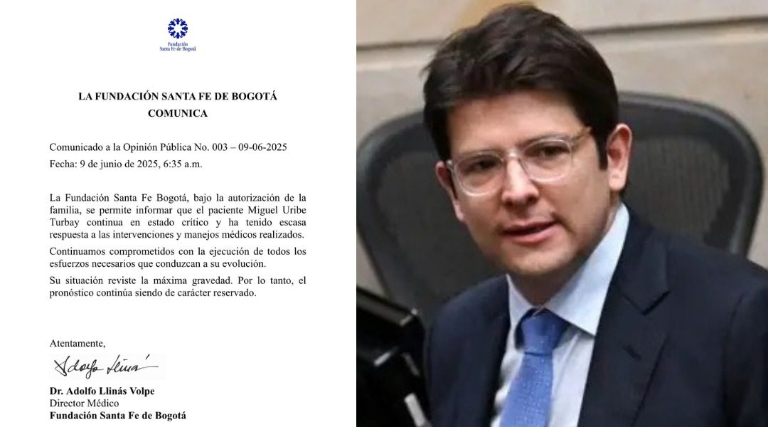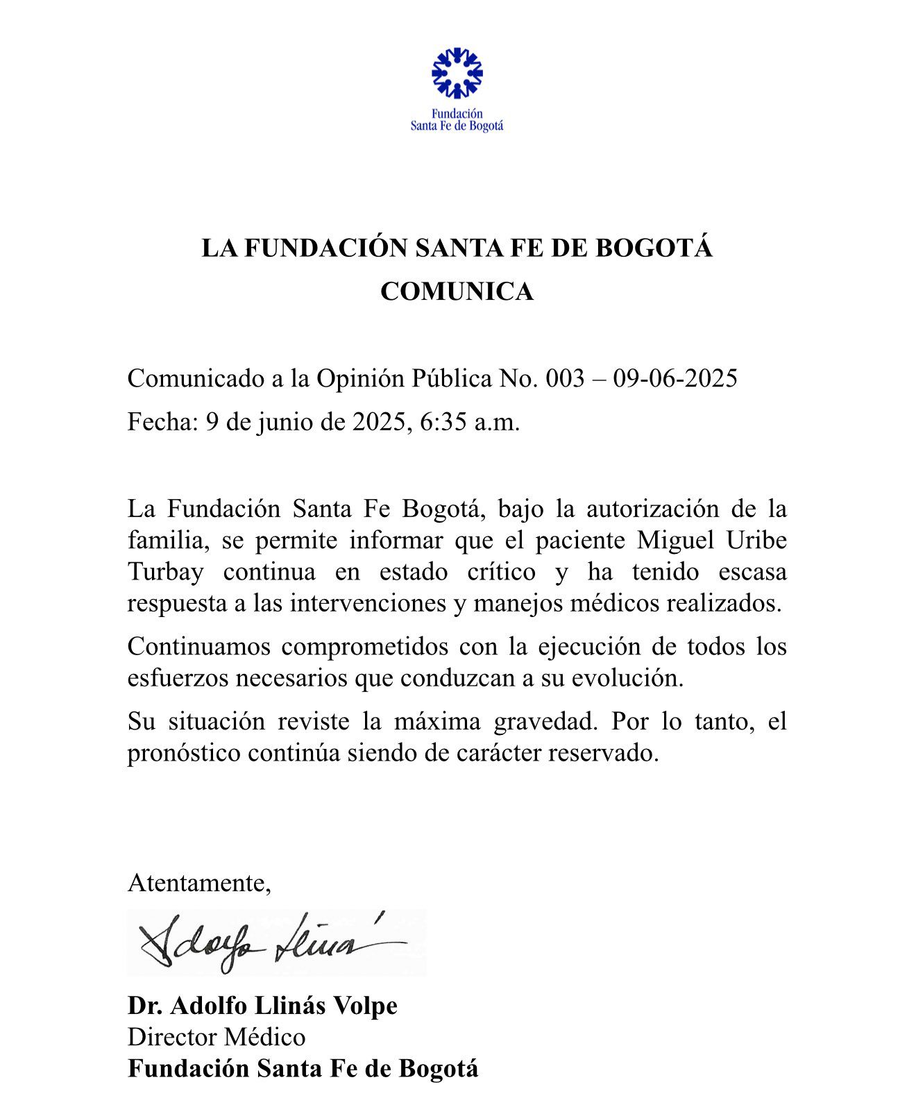 La Fundación Santa Fe de Bogotá emitió un nuevo comunicado sobre la condición de salud de Miguel Uribe Turbay, quien sigue en estado crítico. “Miguel Uribe Turbay continúa en estado crítico y ha tenido escasa respuesta a las intervenciones y manejos médicos realizados”, se lee en el reporte.