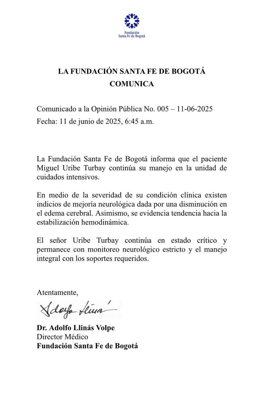 La Fundación Santa Fe de Bogotá informó esta mañana que el estado de salud de Miguel Uribe Turbay sigue siendo crítico, pero presenta indicios alentadores de mejoría neurológica.