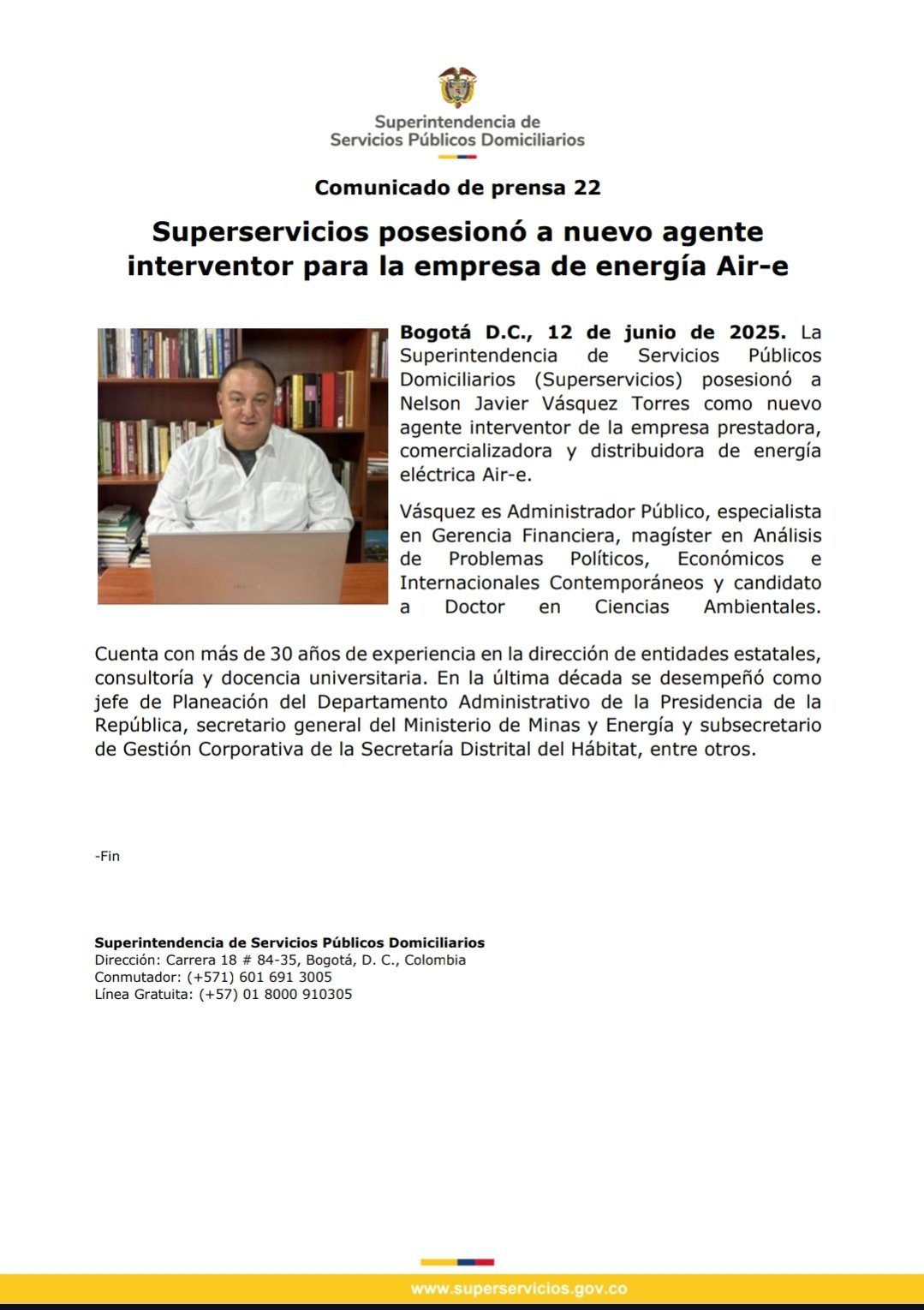 En un comunicado emitido este jueves, la Superintendencia de Servicios Públicos Domiciliarios (Superservicios) oficializó la posesión de Nelson Javier Vásquez Torres como nuevo agente interventor de AIR-E, la empresa de energía eléctrica intervenida que opera en los departamentos del Atlántico, Magdalena y La Guajira.