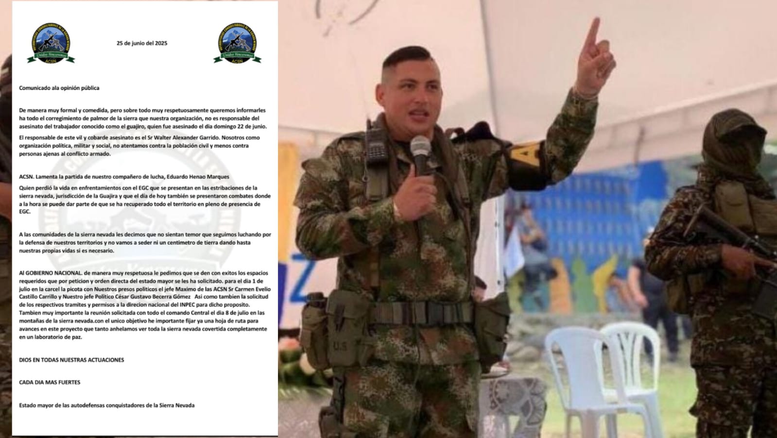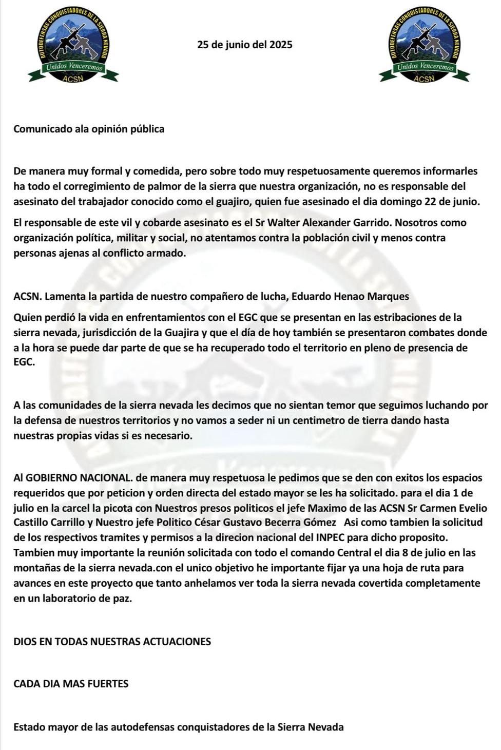 “Por petición y orden directa del Estado Mayor, se ha solicitado una reunión para el día 1 de julio en la cárcel La Picota, con nuestros presos políticos: el jefe máximo de las ACSN, señor Carmen Evelio Castillo Carrillo, y el jefe político César Gustavo Becerra Gómez. Así mismo, se ha requerido al INPEC la gestión de los trámites y permisos necesarios para dicho propósito. También es de suma importancia la reunión solicitada con todo el Comando Central el día 8 de julio en las montañas de la Sierra Nevada”, señala el comunicado.
